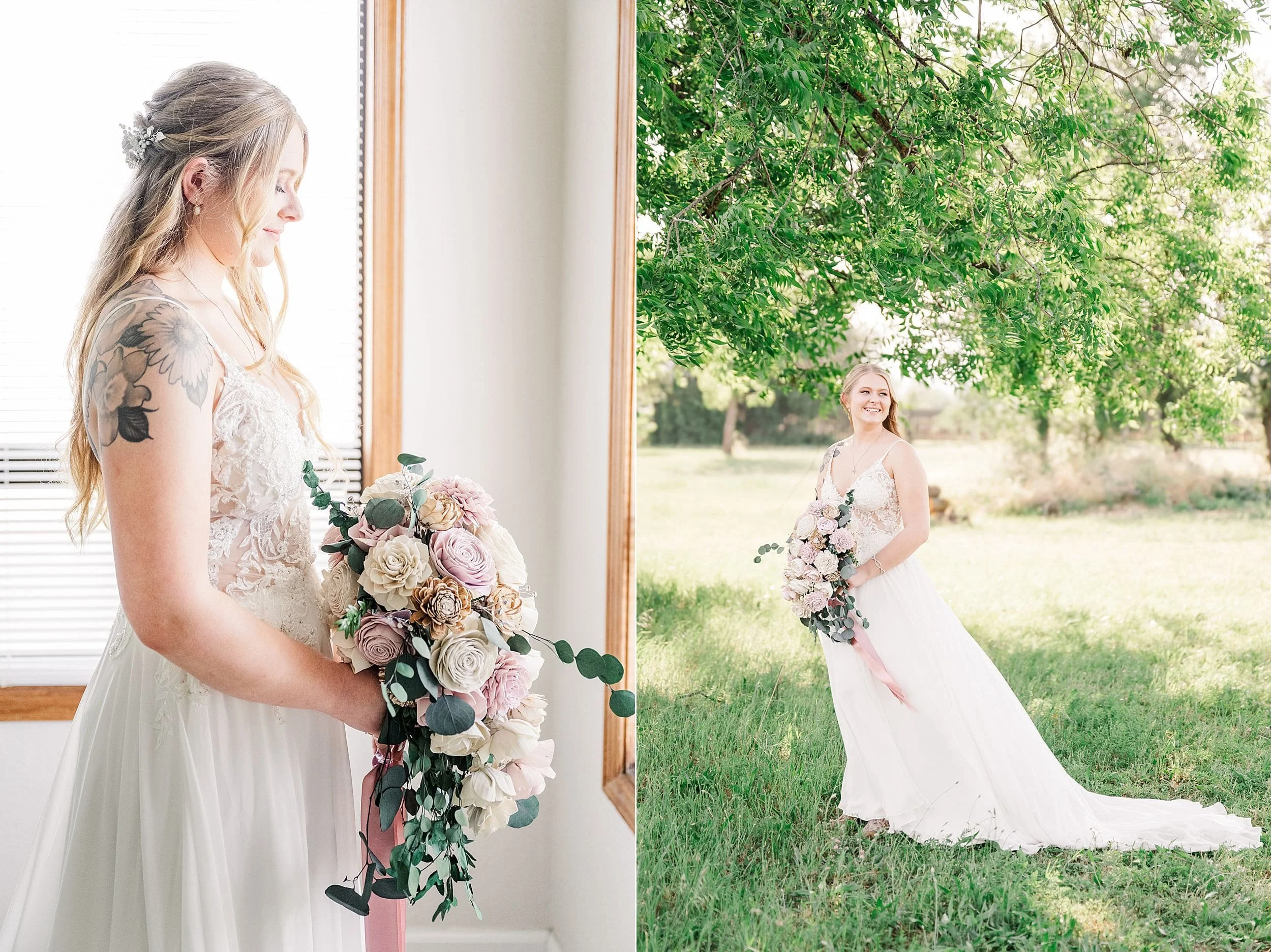 Let me start off first by telling you a little bit about their special day. Their wedding venue was a private residence that held sweet childhood memories for Jade. I loved hearing about how she used to ride her horse to her friends house up the street. We even took photos in front of the hitching rail she used! Those portraits were some of my favorites! When I first arrived, everyone was working on getting ready and there was just a calm excitement in the air. Matt enjoyed hanging out with Jackson and his brother’s (all the groomsmen!) as they got ready. They even had lightsabers attached to their tux’s! (At the bottom of this post you’ll get to see a fun shot with the lightsabers at the end of the reception. So fun!) The girls were all decked out in beautiful rustic pinks with cowgirl boots or sandals. The bouquets were made out of wooden flowers, crafted by her aunt!